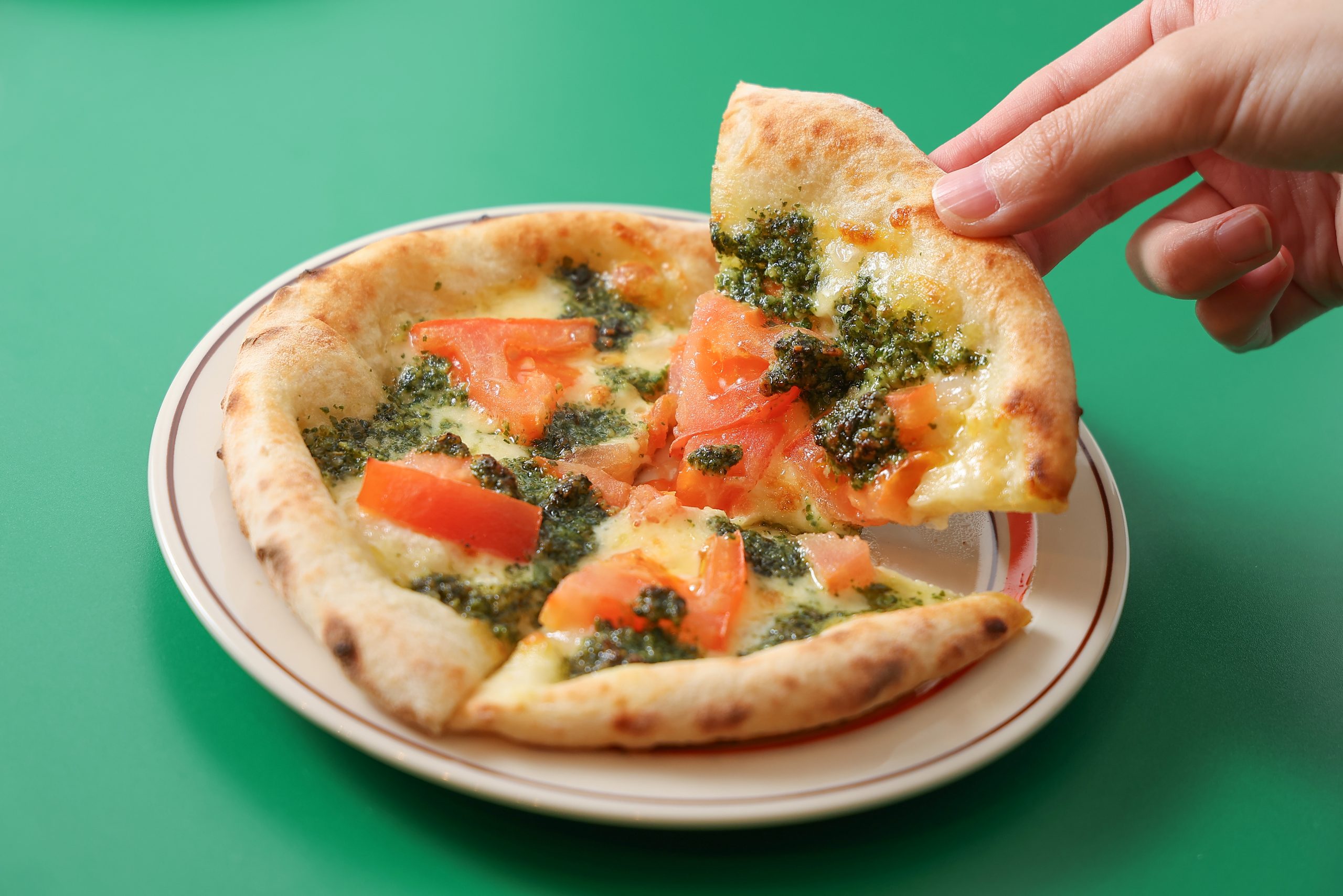広島産トマトのマルゲリータ(ジェノベーゼソース)単品1200円。北海道産の小麦粉を使用した、耳までモチモチの自家製生地が自慢。高温の電気窯で一気に焼くことで、トマトのフレッシュさを生かしている。ほかにも、「広島燻製牡蠣と広島野菜」「チーズと尾道産蜂蜜」など、地元食材の味わいを引き立てた全5種類のピザを用意。