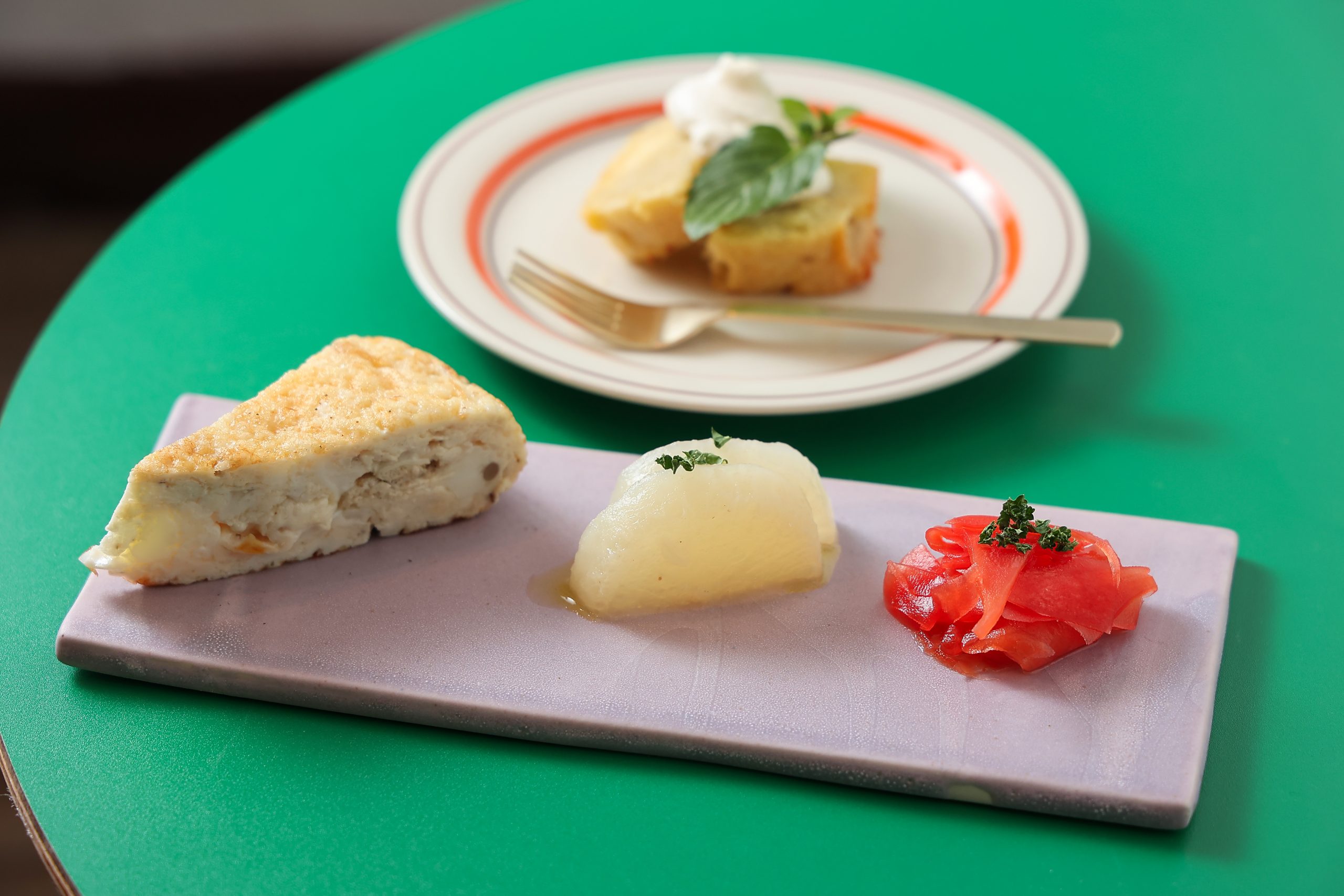選べるピザ1枚のほか、日替わりの前菜3種類とパウンドケーキが付くピザ定食1,200円~。この日の前菜は、金時人参のマリネ、コンソメで煮たイタリアン風おでんの大根、メレンゲで作るオムレツが登場。ピザは1枚直径18cmと食べやすいサイズで気軽に楽しめる。食後には、サツマイモのねっとりとした食感と自然な甘みが感じられるパウンドケーキをどうぞ。