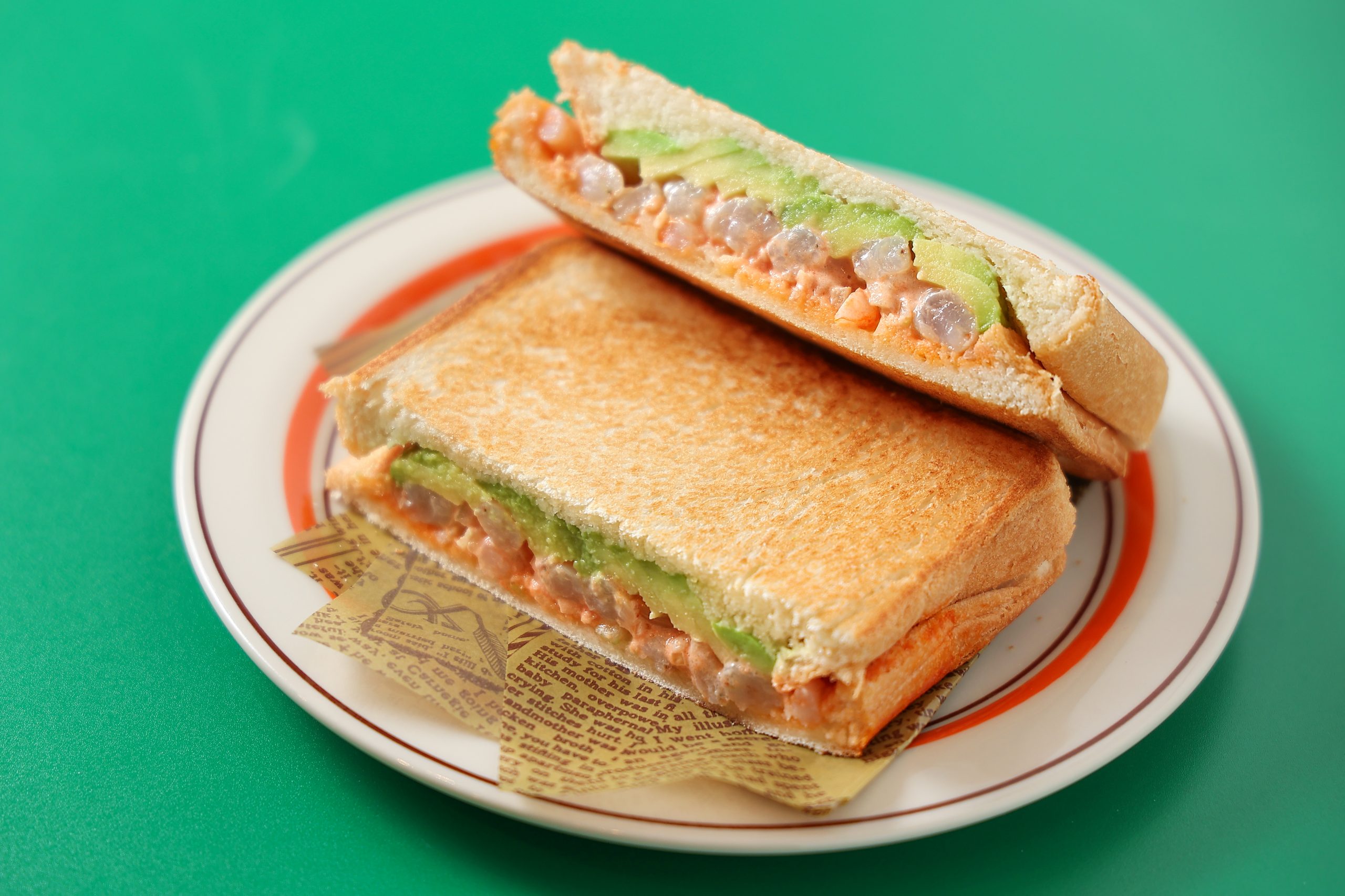 ピザ以外にも、ホットサンドが楽しめる。オーロラソースが好相性の海老アボカド800円(写真)などのほか、ハムチーズ、たまごサンド、タコスミート、照り焼きチキンマヨなど、6種類がスタンバイ。テイクアウトも可能。