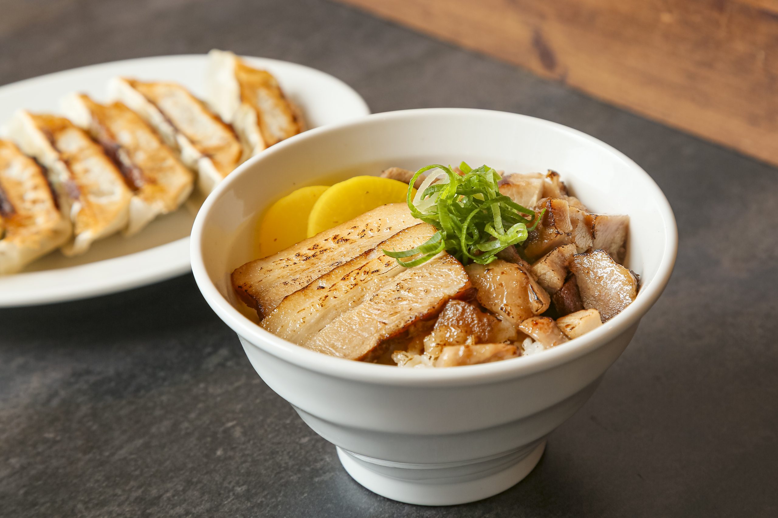 サイドメニューには、自家製の和風ステーキソースがかかったチャーシュー丼450円や、パリッと香ばしい餃子500円などがそろう。今後はフレンチの技法を生かしたラーメンも提供する予定なので要チェック。