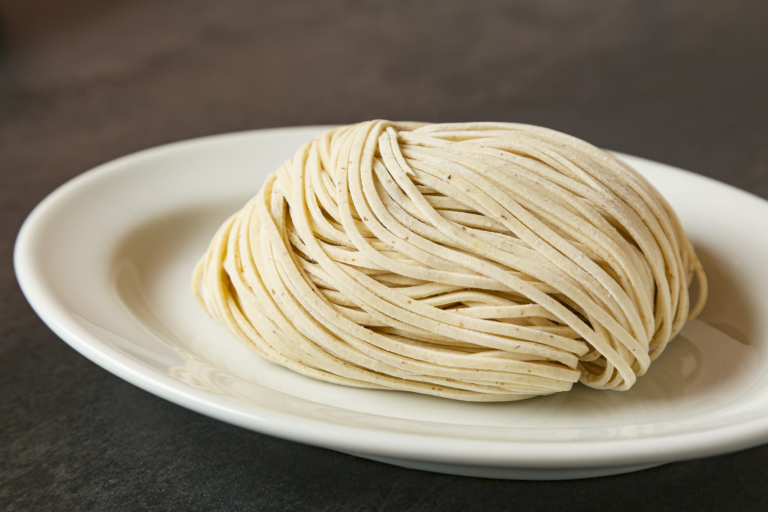のど越しの良い麺は、創業70年を誇る福山市『松岡製麺』の平打ち麺を使用。北海道産の小麦粉〈春よ恋〉と〈ゆめちから〉をブレンドし、さらに全粒粉を加えており、コシと小麦の風味がしっかりと引き立っている。内海町にある『横島ファーム』の〈うつみ潮風豚〉のチャーシューは、「特長の異なるチャーシューを同時に楽しんでほしい」という店主の思いから2種類をトッピング。例えば、柔らかくジューシーな脂身のバラ肉、しっかりとした食感のウデ肉やモモ肉などが日替わりで登場する。