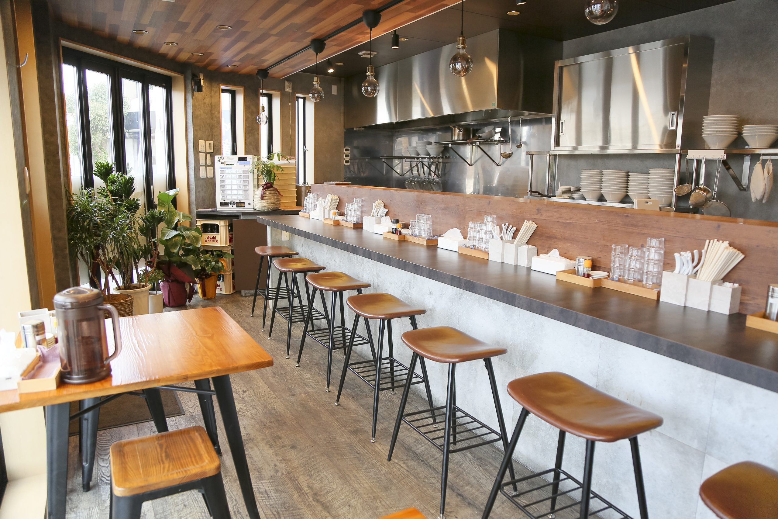 鮮やかな青い看板が目印。モダンな雰囲気の店内には、カウンター7席、テーブル2卓を設ける。