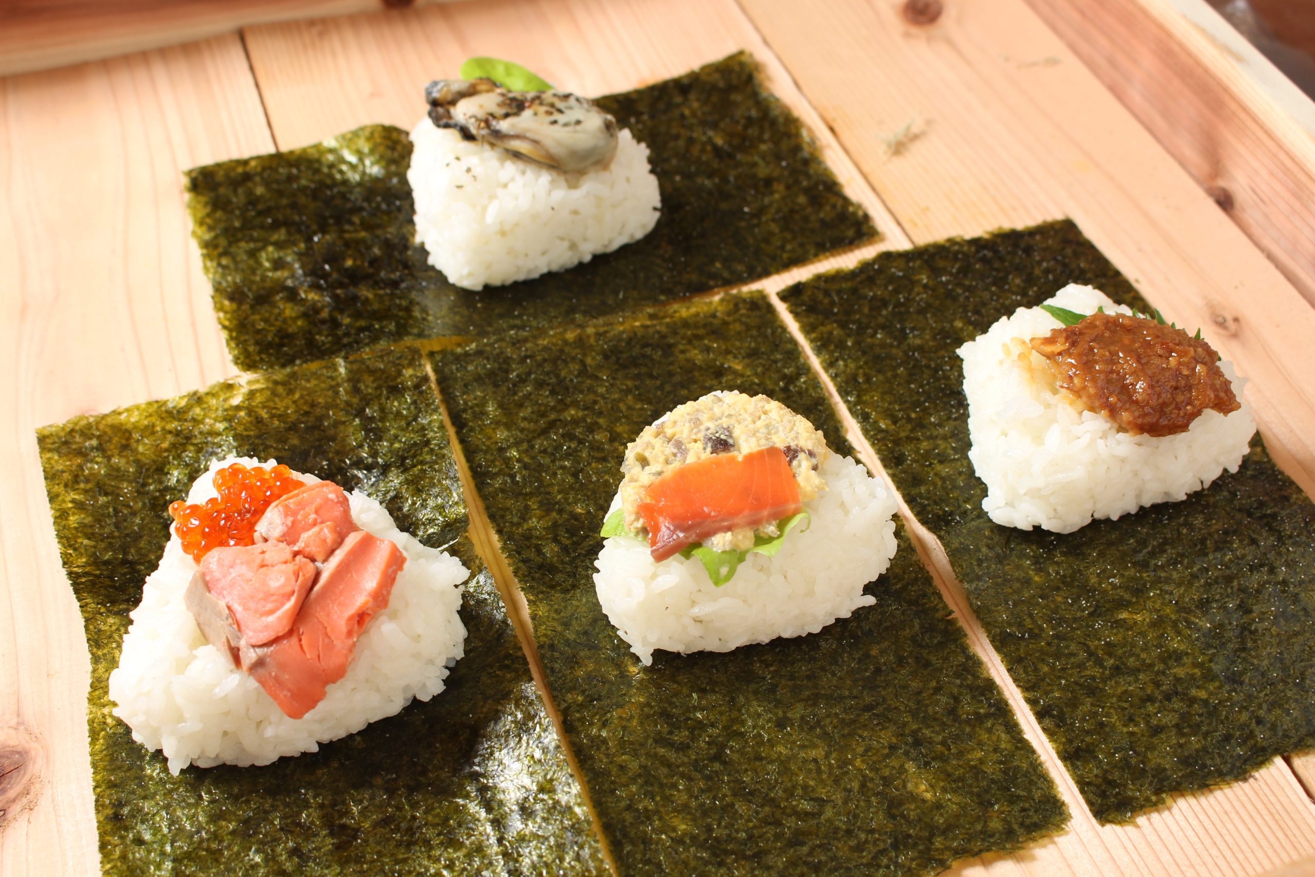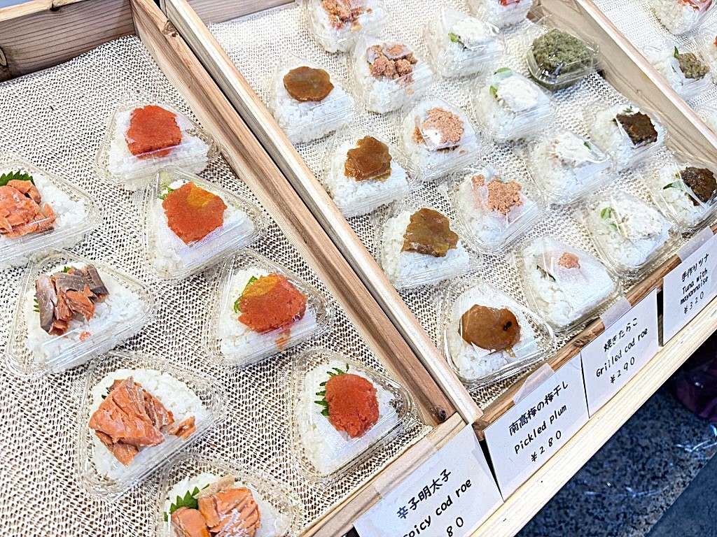 店頭に並ぶのは、広島県東広島市『ふぁーむたかちゃんち』による特別栽培米〈にこまる〉を、ふっくらと炊きあげふんわり握ったおにぎりの数々。〝冷めても美味しいものを〟と厳選したお米を使ったおにぎりは、時間が経っても本当にやわらかい。また海苔も、福岡県久留米市にある『亀屋海苔』の塩海苔を個別包装し、海苔の風味とパリパリの食感を楽しめるようになっている。