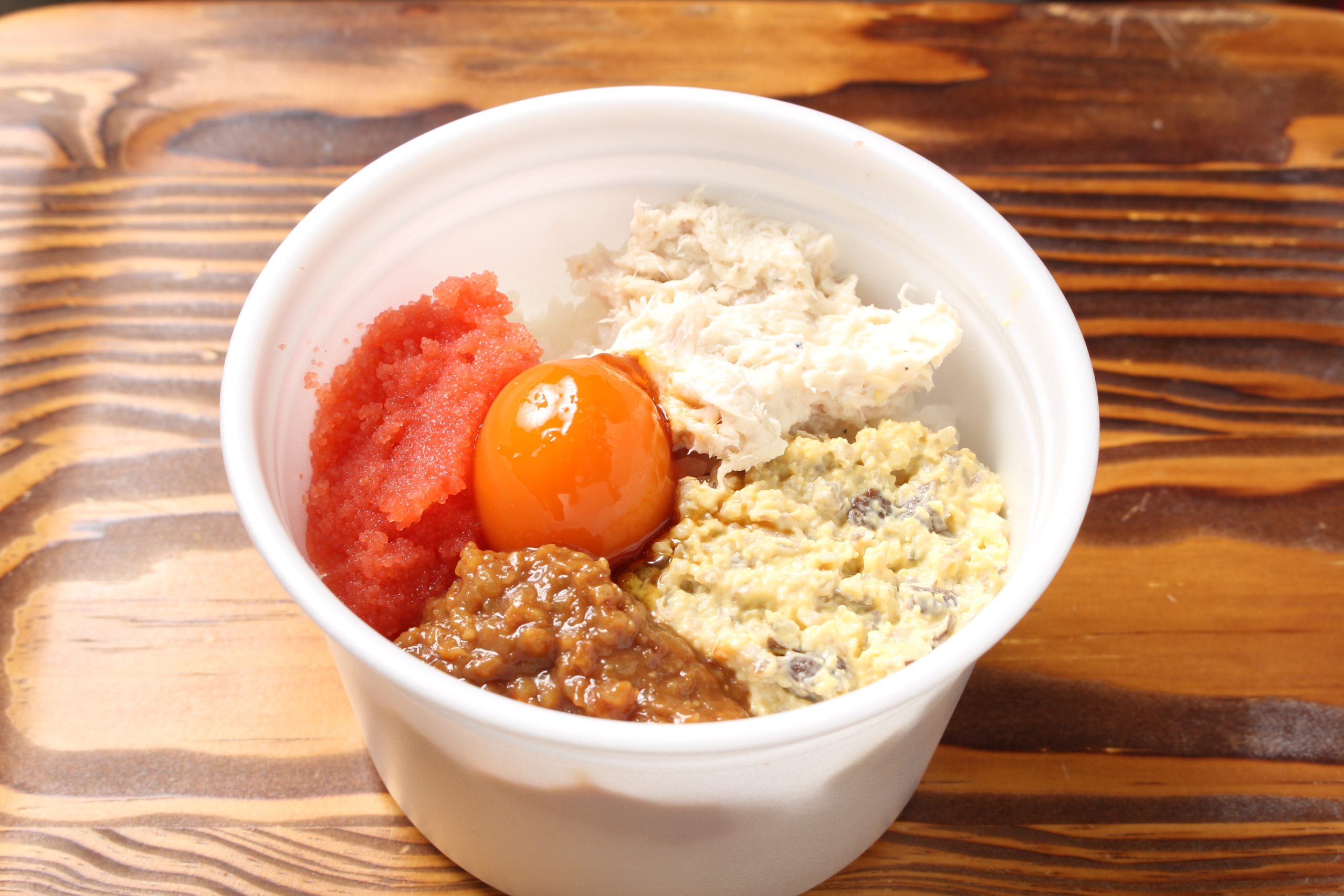 そのほか、ランチなどにぴったりの丼も提供。SANTOのこうじ、いぶりがっこタルタル、ツナマヨ、明太子、卵黄のしょうゆ漬けが少しずつ満喫できるまかない丼800円(写真)をはじめ、穴子丼900円、卵黄穴子丼950円など、ほどよいサイズ感なのがうれしい。
