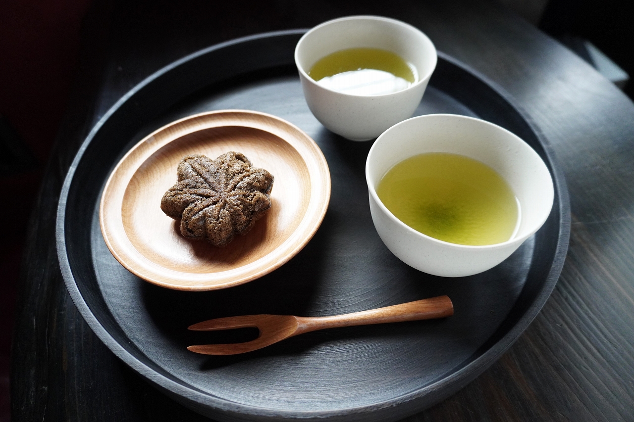 メニュー表には「煎茶」「和紅茶」「焙じ茶」各1,000円といった名前が並ぶ。どのお茶にしようか迷った時は、上小田さんに尋ねてみよう。お茶の背景や作り手の思いを丁寧に教えてもらえるはず。店では、さっぱりした一煎目と、お茶本来の味がダイレクトに伝わる二煎目を提供。味の違いを飲み比べできるのがうれしい。スイーツと一緒に楽しむなら、お茶とベイクド紅葉セット1,350円(写真)がオススメだ。