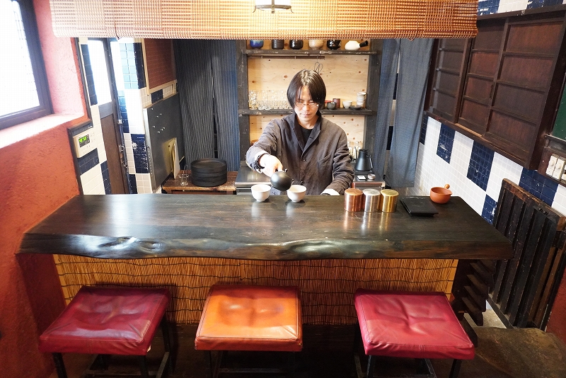 古民家を改装した店舗1階が日本茶専門店、2階は系列のゲストハウス『傾㐂屋 Kabukiya』に。「農薬や化学肥料を使わずに栽培されたお茶を中心に、極力他店が扱っていないものをセレクトしています。全国の個性ある日本茶の魅力を幅広く知っていただきたい」。そう話すのは、日本茶スタンドに務めていた経歴を持つ店長・上小田さん。茶種に応じてベストな茶葉量や温度を見極め、一杯ずつ丁寧に淹れる。