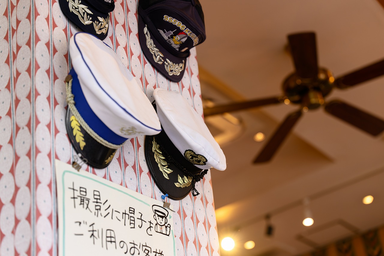 “日本で唯一潜水艦を眺めながら珈琲が飲める喫茶店”として営業するこちら。店内には記念撮影用に海上自衛隊の帽子が置かれているので、記念に写真を撮って帰るのもいい。