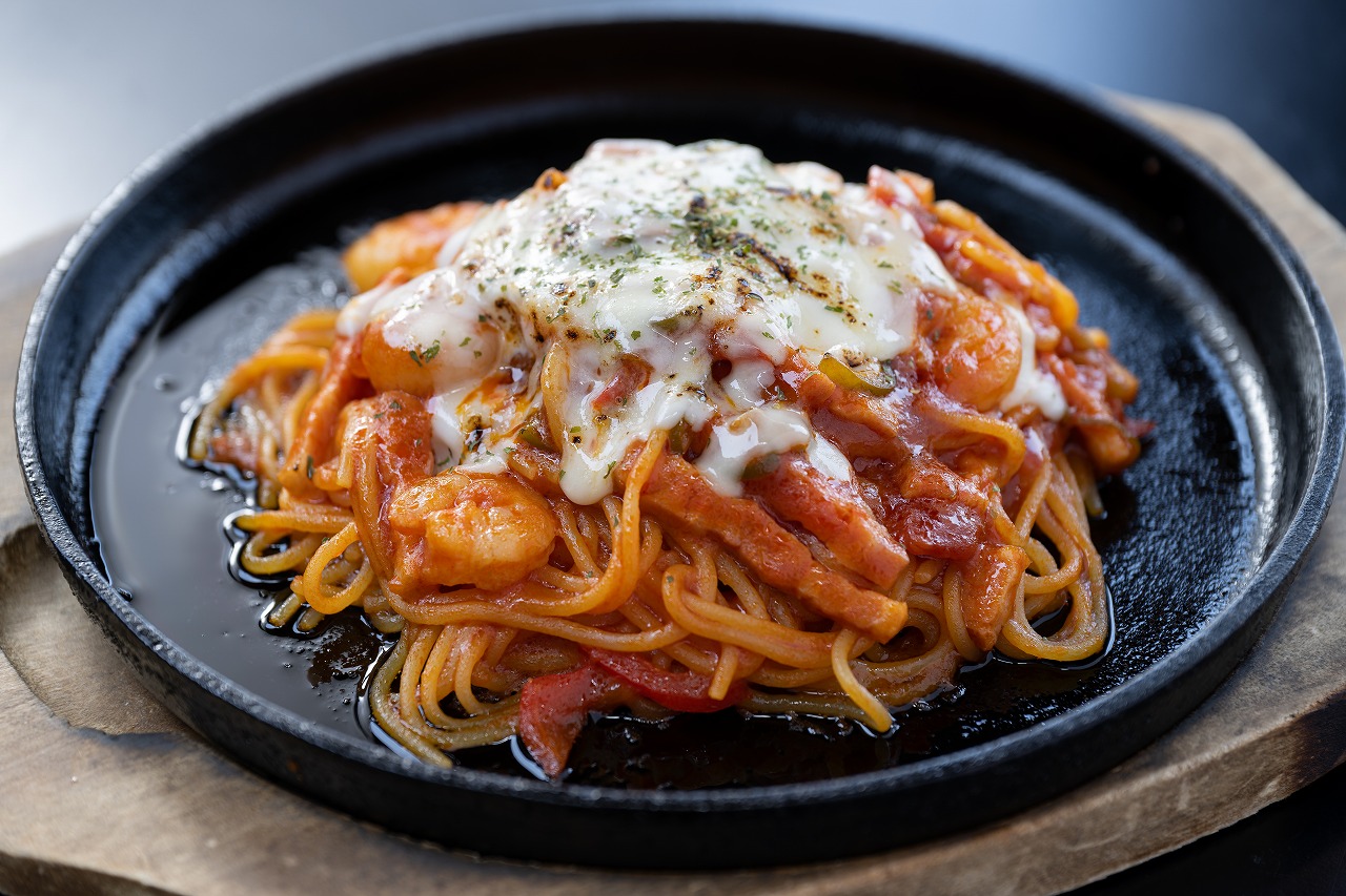 ここで味わえるのは、冷めないよう鉄板で提供される鉄板エビチーズナポリタン単品1,080円。もちもち食感の生パスタに、濃厚なトマトソースがよく絡む。最後の最後まで熱々のまま食べ尽くそう。実はこちらのメニュー、月~金曜のランチタイム限定で、90分制のピザ食べ放題&ドリンクバー付きに(その場合は1,180円)。しっかり食べたい人は平日のランチタイムを狙うのがオススメだ。