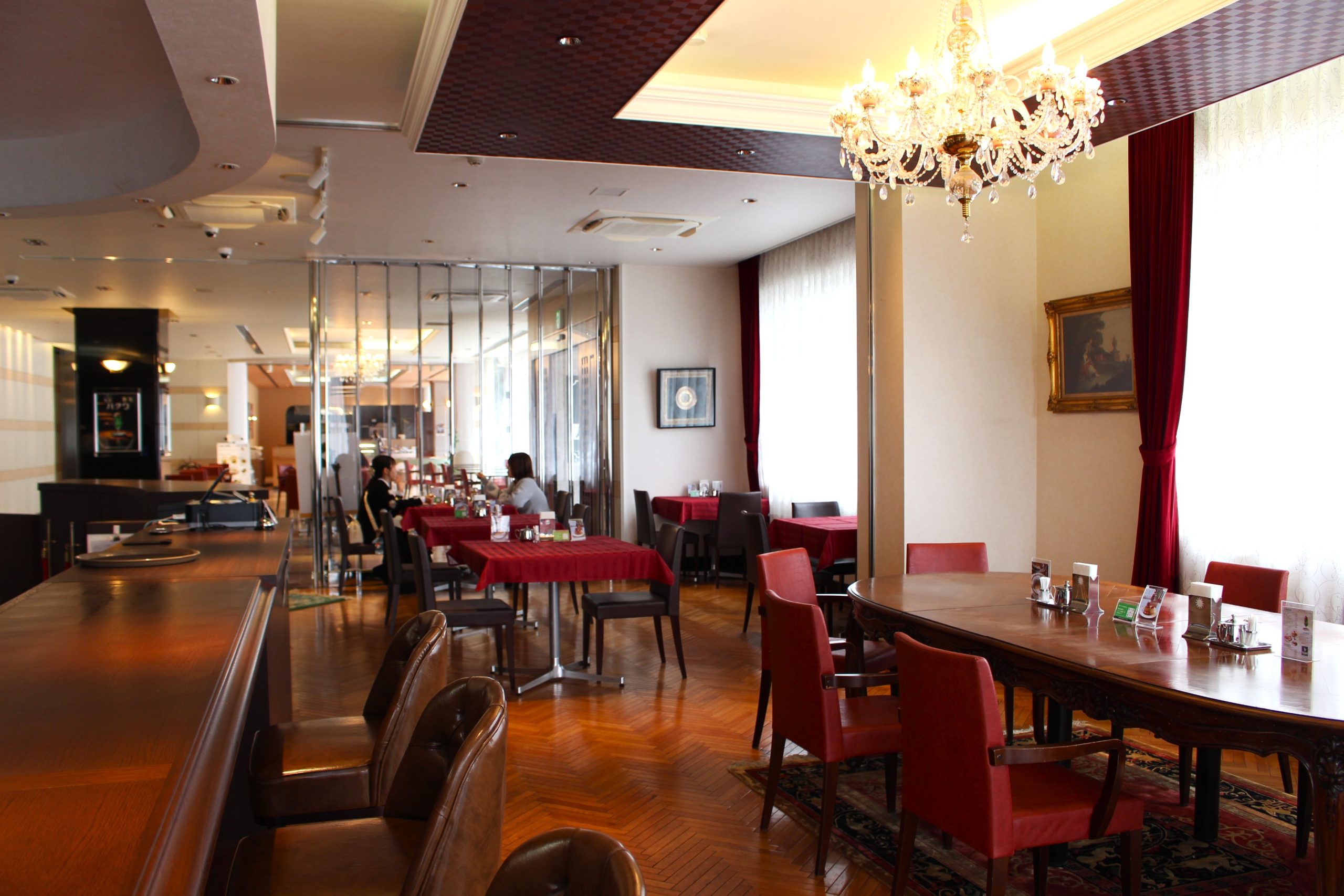 店内には大きな丸テーブルやシャンデリア、ビンテージ風絨毯、ワインレッドのカーテンなどが備わっており、まさに昭和を思わせる昔ながらの喫茶店そのもの。ホテルのレトロなイメージに合うよう一つひとつのインテリアを厳選し、落ち着きのある空間を演出している。