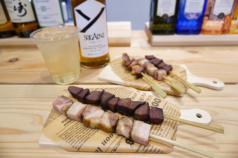 イチオシ商品は、デンマーク産の豚バラ肉を用いて作られた、大サイズの燻製ベーコン串1本600円。キメが細かく柔らかな食感で、あっさりとした脂のうま味が楽しめる。このほか、大サイズの燻製牛タン串1本700円や、小サイズの燻製肉串3種盛り1,000円なども人気を集めている。合わせたいお酒は、広島発のウイスキー・SOGAINI(ソガイニ)1杯700円。「クセがなくて飲みやすく、ウイスキー初心者の方にオススメです」と店長・水田さん。ほのかな樽の香りと、燻製の奥深く香ばしい風味の好相性を堪能したい。