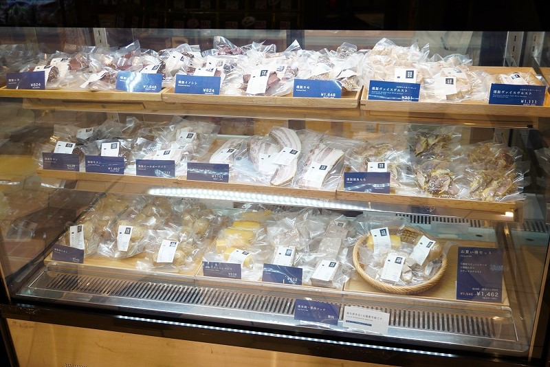 ショーケースには、真空パックの燻製商品がずらり。とののベーコン。1,190円、燻製牛タン690円~、燻製シカ890円~、燻製親鳥もも690円、燻製ステッペンチーズ690円、燻製味たまご590円など、種類豊富に取りそろえる。自宅用や手土産として買い求めるのもいい。