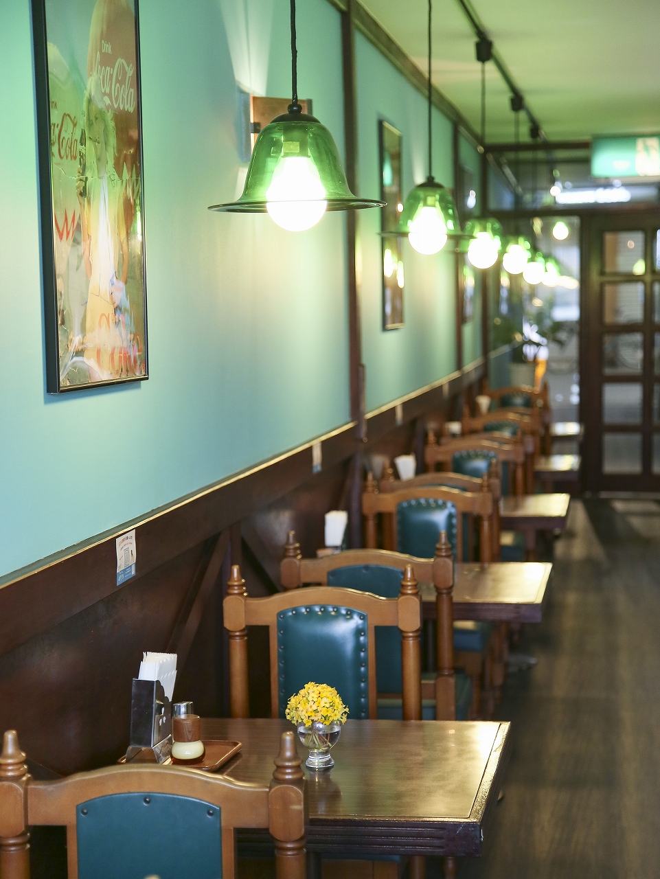 店内は、昔ながらの調度品が醸し出すたたずまいを生かしつつ、モダンでクリーンな印象を加えた店へと改装。〝ティファニーブルー〟に一新された壁が、旧店舗から引き継いだ家具と調和している。椅子とテーブルは、旧『よたろう』の開店当時からある頑丈な造りのオーダー品で、今も美しいまま。椅子の座面だけ張り替えて使用している。