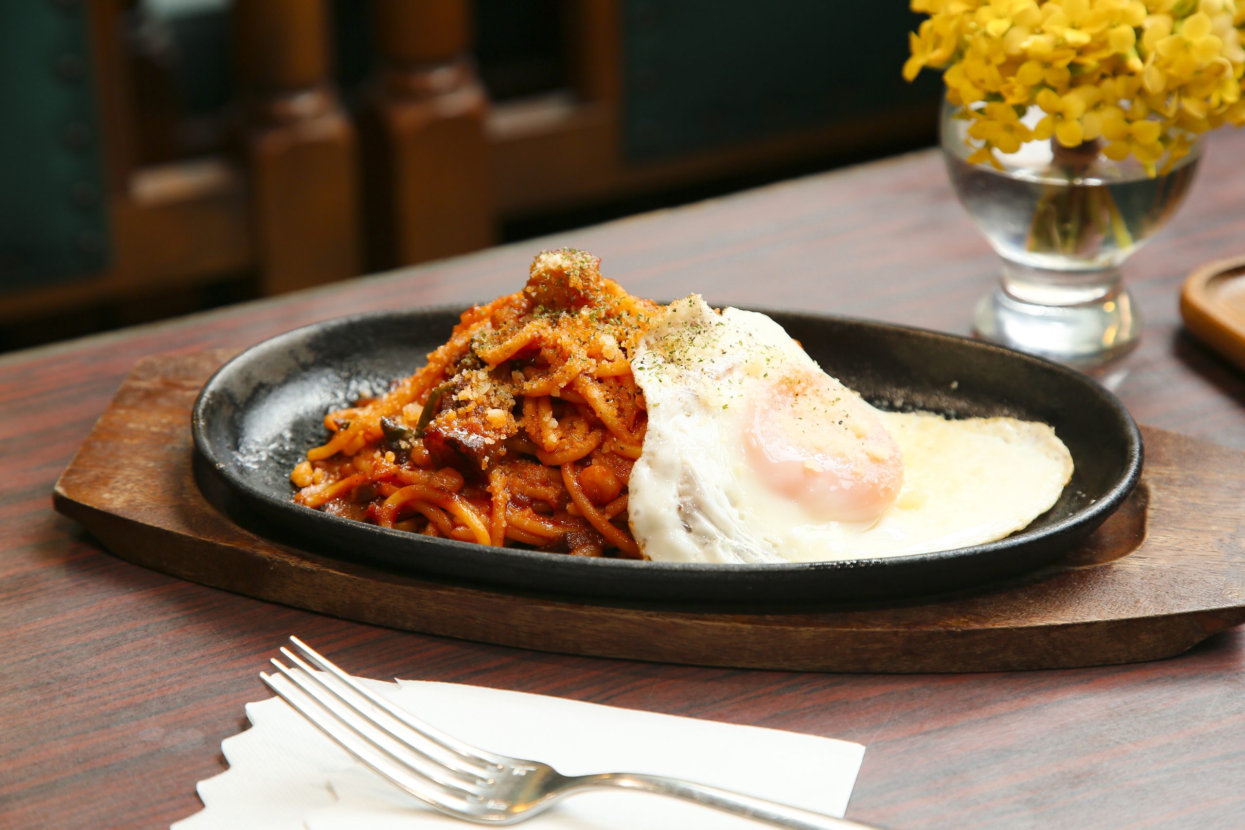 こちらで味わえるのが、尾道ナポリタン1,000円。麥田さんが『よたろう』のすぐそばで営む尾道ラーメン店で使われている具材が、味の決め手だ。角切りのチャーシューがゴロゴロ入っていて食べ応えアリ! さらに、スパゲッティ、玉ねぎ、ピーマンなどを、ラーメンの背脂で炒めてコクをプラス。尾道ならではの一皿に仕上がっている。旧『よたろう』時代から大切に使われてきた鉄板で提供され、熱々で味わえるのもうれしい。上に乗った半熟目玉焼きを崩しながら、召し上がれ♪