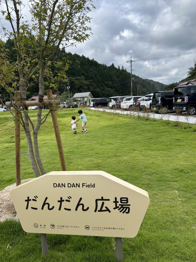 外には芝生が広がる「だんだん広場」があります。私の子どもたちは思いっきり走り回って、楽しそうに遊んでいました! (ちなみに写っているのは長男と次男です)
