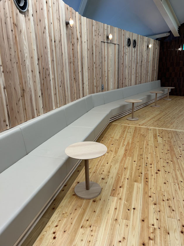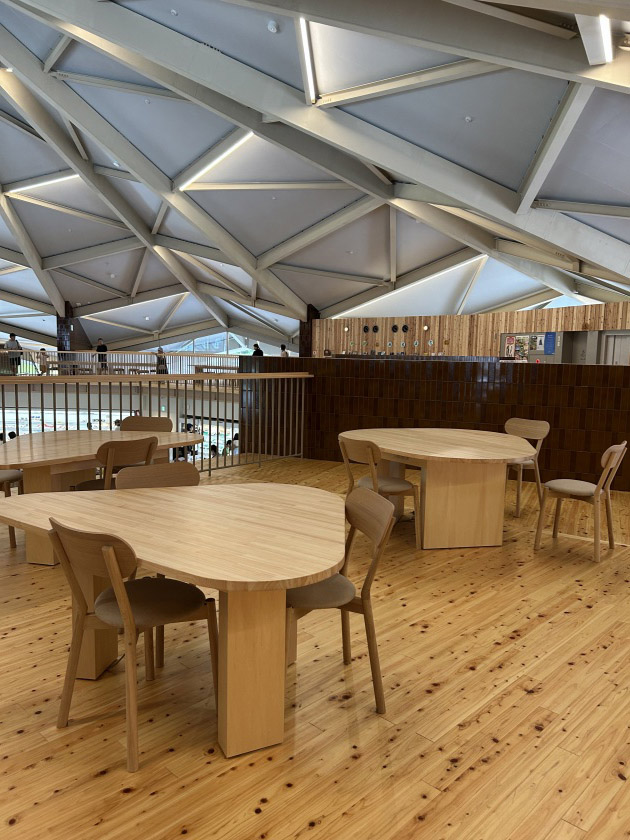 中に入ると、木のぬくもりを感じる広々とした空間が広がっています。天井が高く、開放感たっぷり!