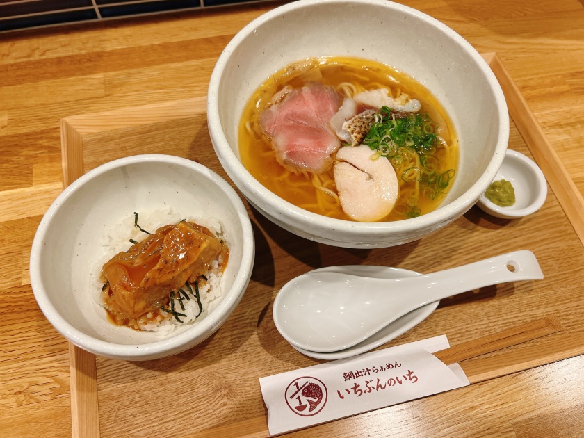 まずは「鯛出汁 鯛らぁめん」から。鯛の出汁が効いて、あっさりとした味わいです。別添えの柚子胡椒を入れたら、味にアクセントが加わってさらに美味!