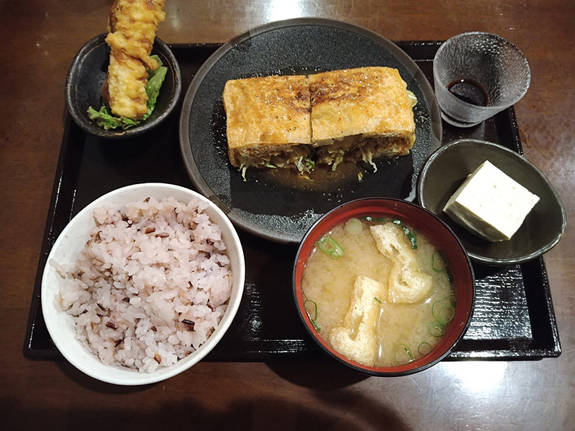 この日私が注文したのは、20食限定の油揚げ定食。ボリューミーな油揚げと生湯葉の天ぷら、やっこ、黒米ご飯、みそ汁がセットになっています。