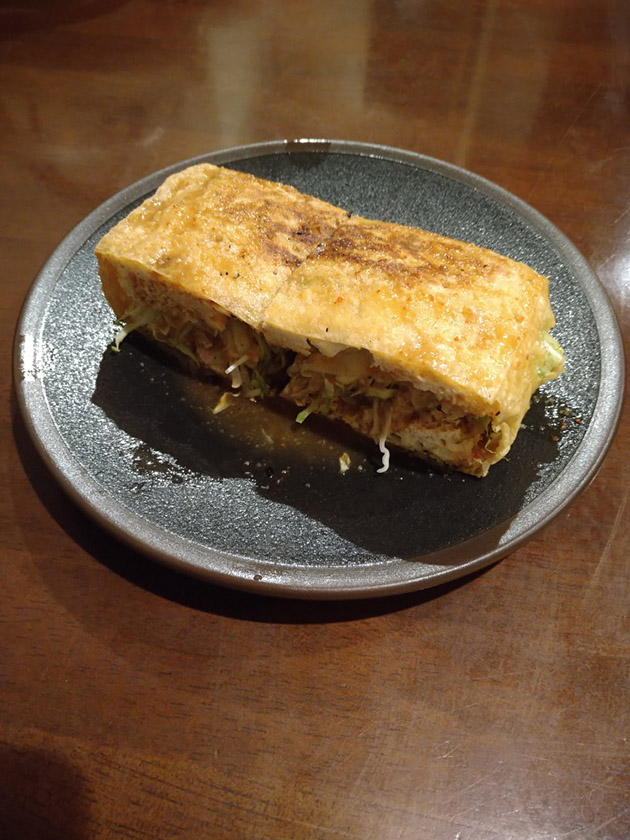 油揚げは表面がカリッとして香ばしく、ピリ辛のタレとマッチ! 中にはキャベツがたっぷり入っていて、食べ応え抜群です。