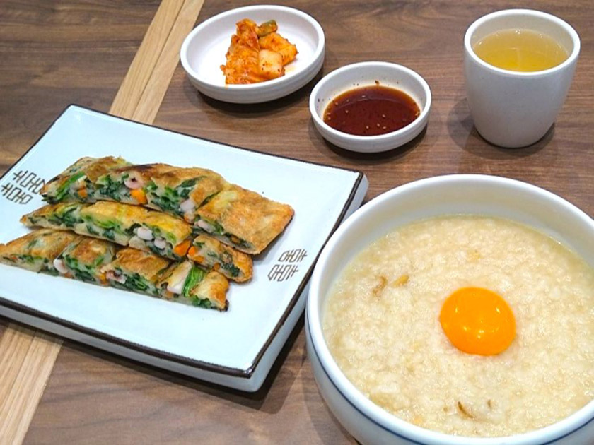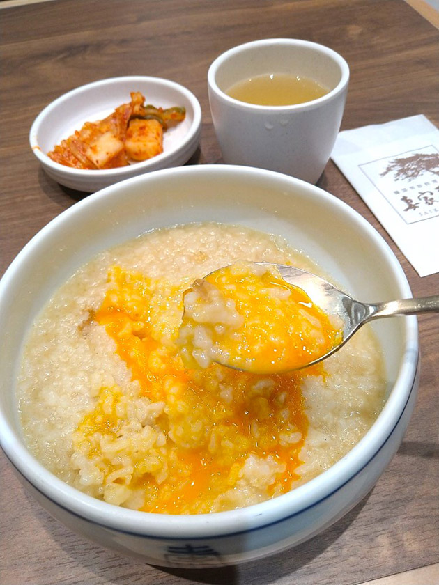 こちらが、あわびのおかゆ! 見た目はいたってシンプル。別添えの卵黄とキムチがセットになっています(国産米使用)。