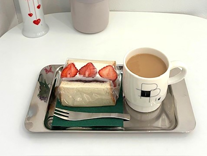 ショーケースにずらりと並んだフルーツサンドに、クッキーやサブレ。どれもおいしそうで悩んでしまいました…。今回は、いちご大福とカフェオレをいただきました!
