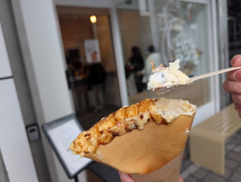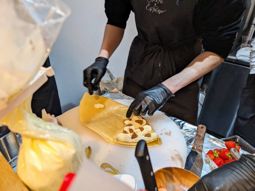 国内外に40店舗以上を展開する『パンとエスプレッソと』と、グルメインフルエンサー・ウルフさんの共同開発で誕生した〝パリパリ食感の黄金クレープ〟。今回は、「ストロベリーホワイトチョコメルト」と「カスタードブリュレとチョコレート」の2つを注文しました。見た目がかわいくて、クリームもおいしかったけど、食べ進めていくたびに生地の味わいが際立っていく。まるでクッキーや焼き菓子のような、生地だけでこんなにおいしいクレープは初めてかも! 注文を受けてから1枚ずつ焼き始めていく理由は、生地の繊細なパリパリ感をとても大切にしているからだそうです。