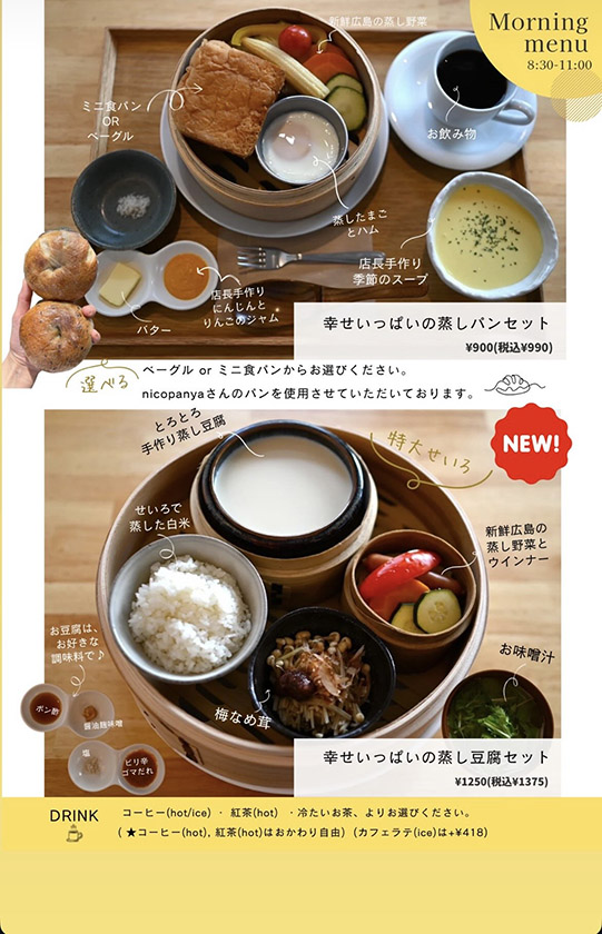 土曜日限定のモーニングや、今年1月から始まったカフェタイムの「せいろ蒸し餅」も気になります。