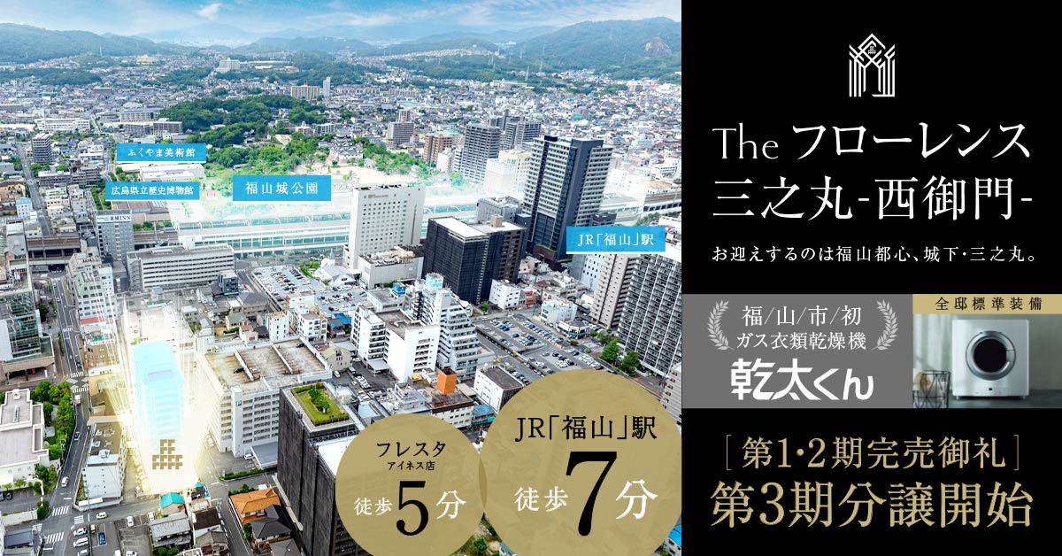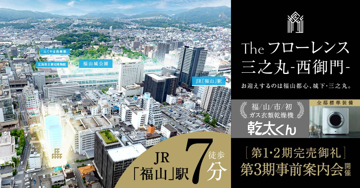 再開発エリアとして注目が集まる福山市三之丸町に、新しい分譲マンション『Theフローレンス三之丸-西御門-』が誕生! ハイグレードな標準設備、安心の最新セキュリティなど、暮らしやすさを追求したマンションです。そんな『Theフローレンス三之丸-西御門-』を徹底解剖しつつ、マンション建設地周辺の注目スポットをご紹介していきます。福山駅前という好アクセスに加え、周辺には暮らしを彩るお店や施設が大充実。新しい暮らしをイメージしながら散策してみて!