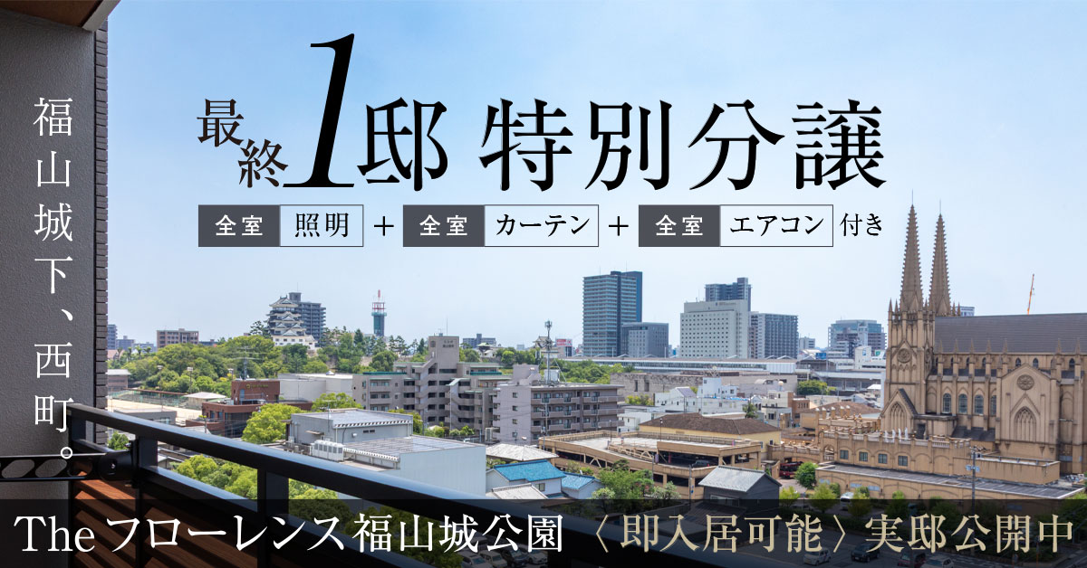 福山市西町に、新しい分譲マンション『The フローレンス福山城公園』が誕生! 福山駅からすぐという好アクセスに加えて、福山城を望む見晴らしの良さや、ハイグレードな標準設備、安心の最新セキュリティなど、魅力がいっぱい。暮らしやすさを追求したマンションになっています。そんな『Theフローレンス福山城公園』を徹底解剖しつつ、マンション建設地周辺の注目スポットをご紹介していきます。