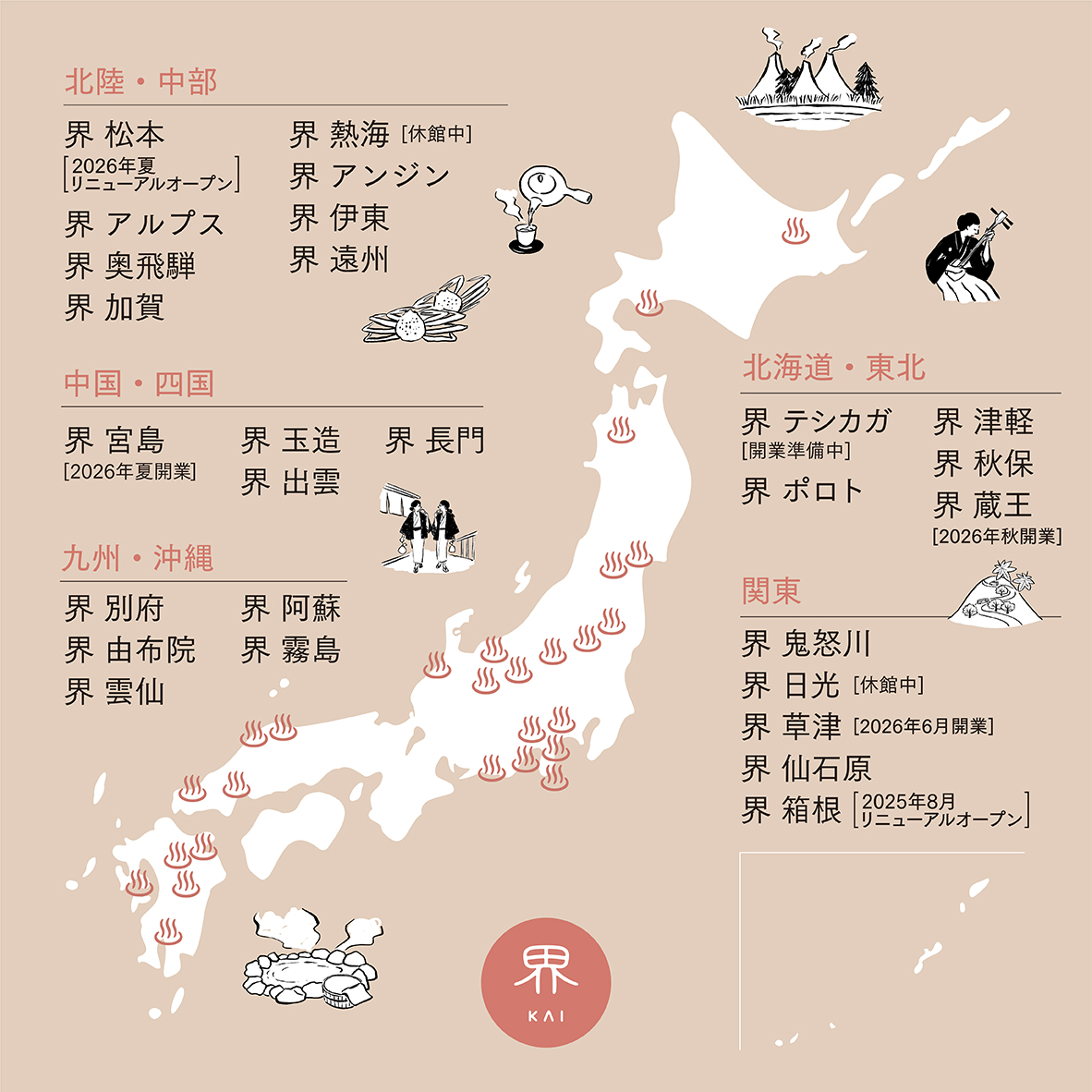 星野リゾートが全国に23施設を展開する温泉旅館ブランド〈界〉。「王道なのに、あたらしい。」をテーマに、季節の移ろいや和の趣、伝統を生かしながら現代のニーズに合わせたおもてなしを追求している。また、その地域の伝統文化や工芸を体験する「ご当地楽」や、地域の文化に触れる客室「ご当地部屋」が特徴的。2026年には『界 宮島』(広島県)、『界 草津』(群馬県)、『界 蔵王』(山形県)の開業、『界 松本』(長野県)のリニューアルオープンを予定している。