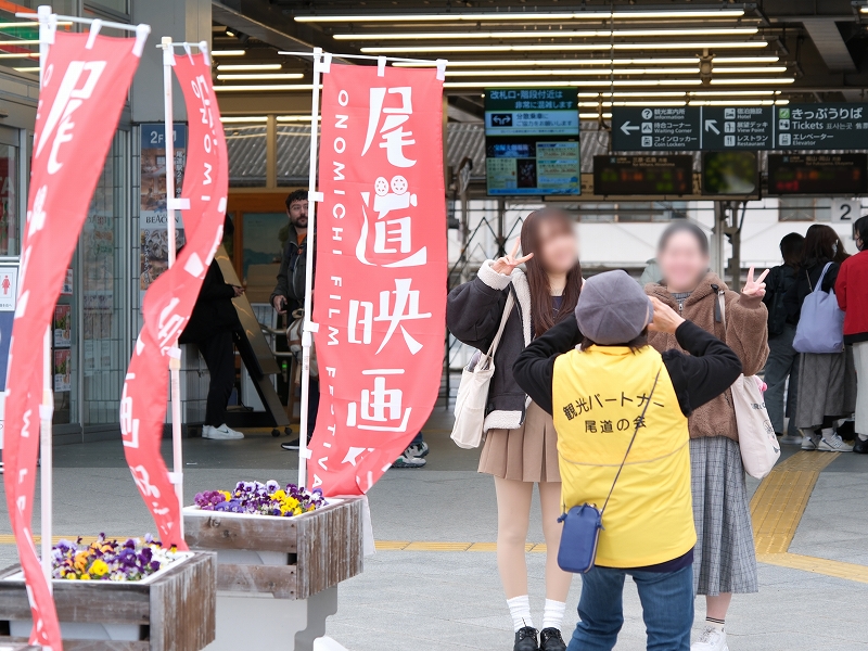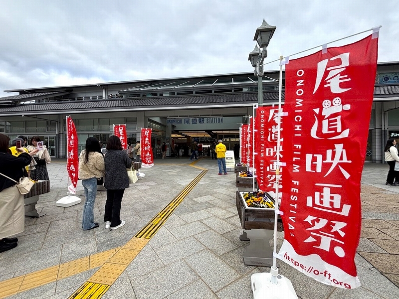 当日の朝、尾道駅前では、映画祭ののぼりと駅を写真に収める人たちで賑わっていました。会場のひとつ、『シネマ尾道』の前にも大行列が!