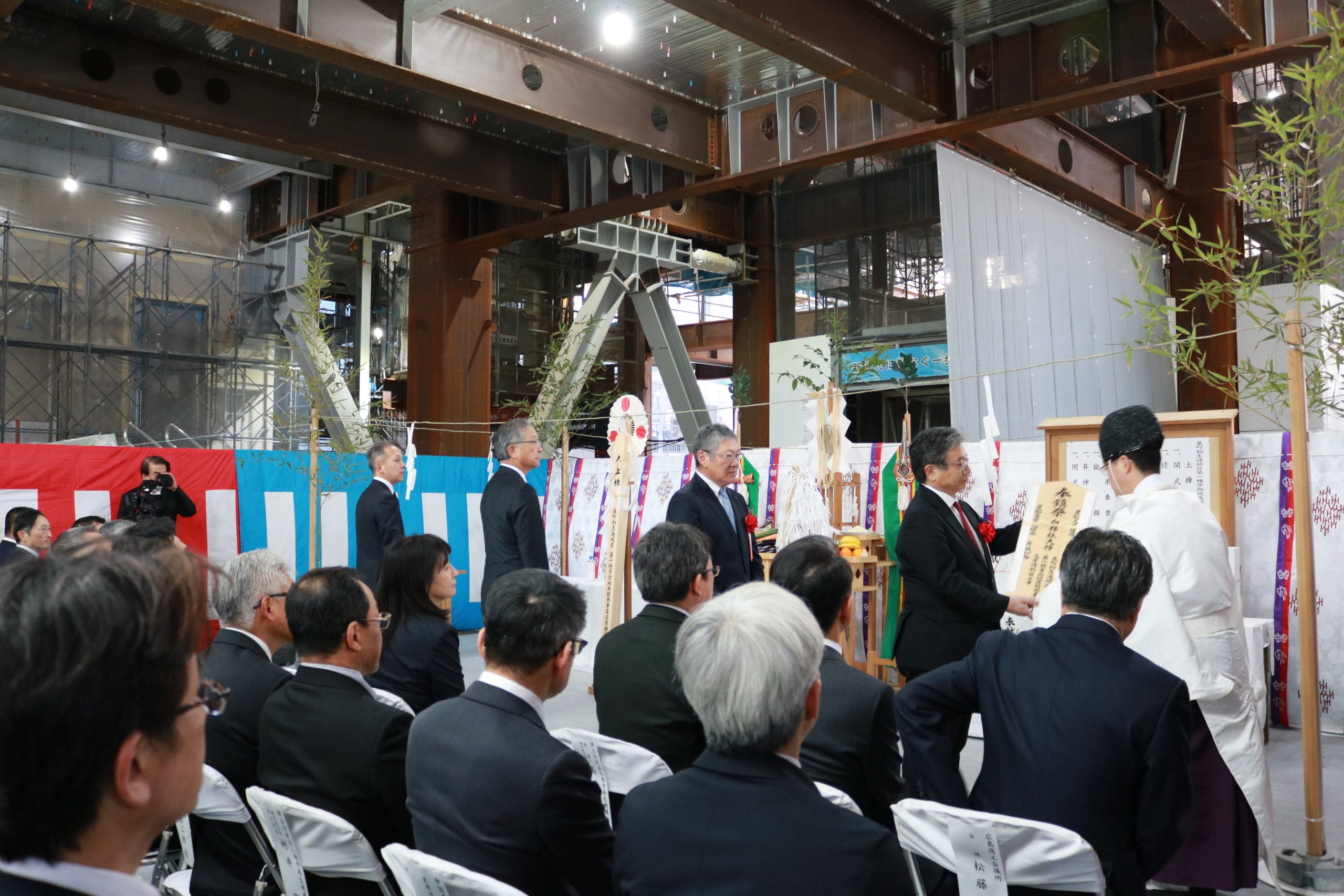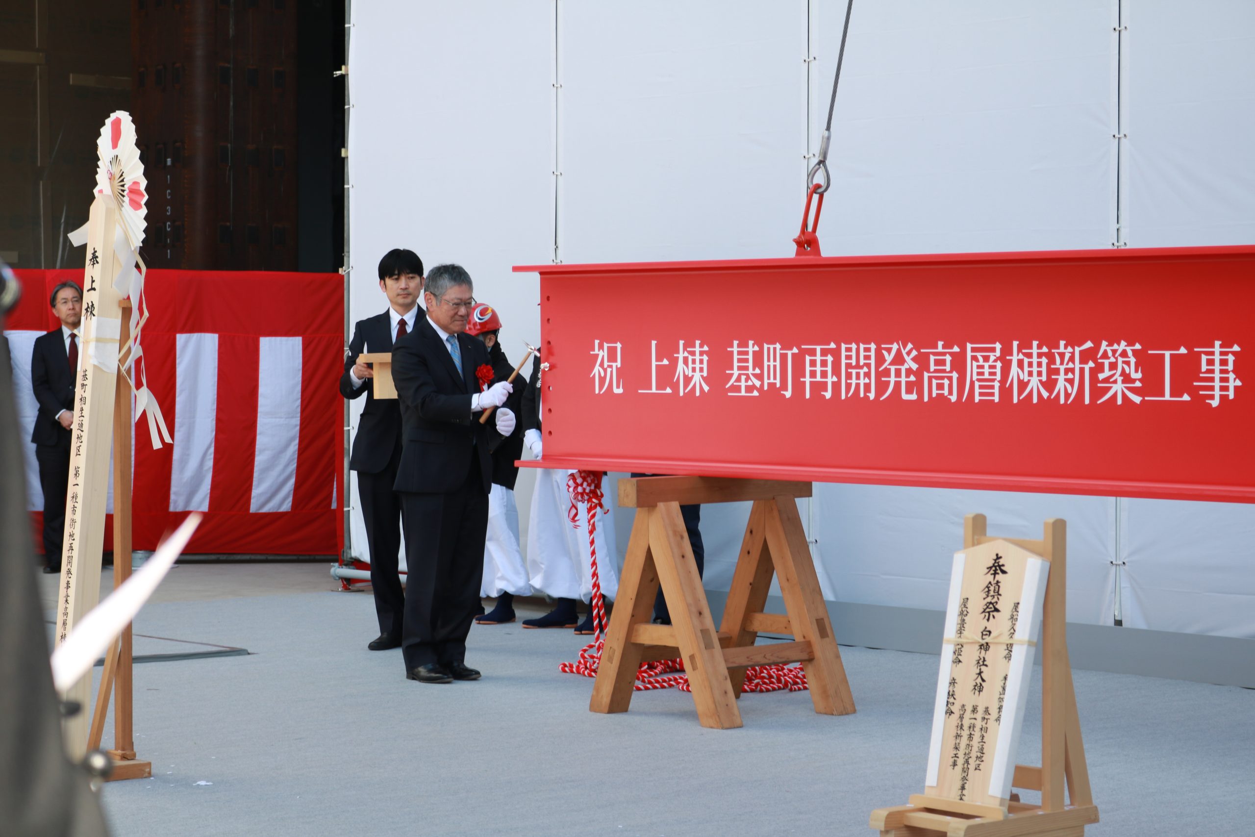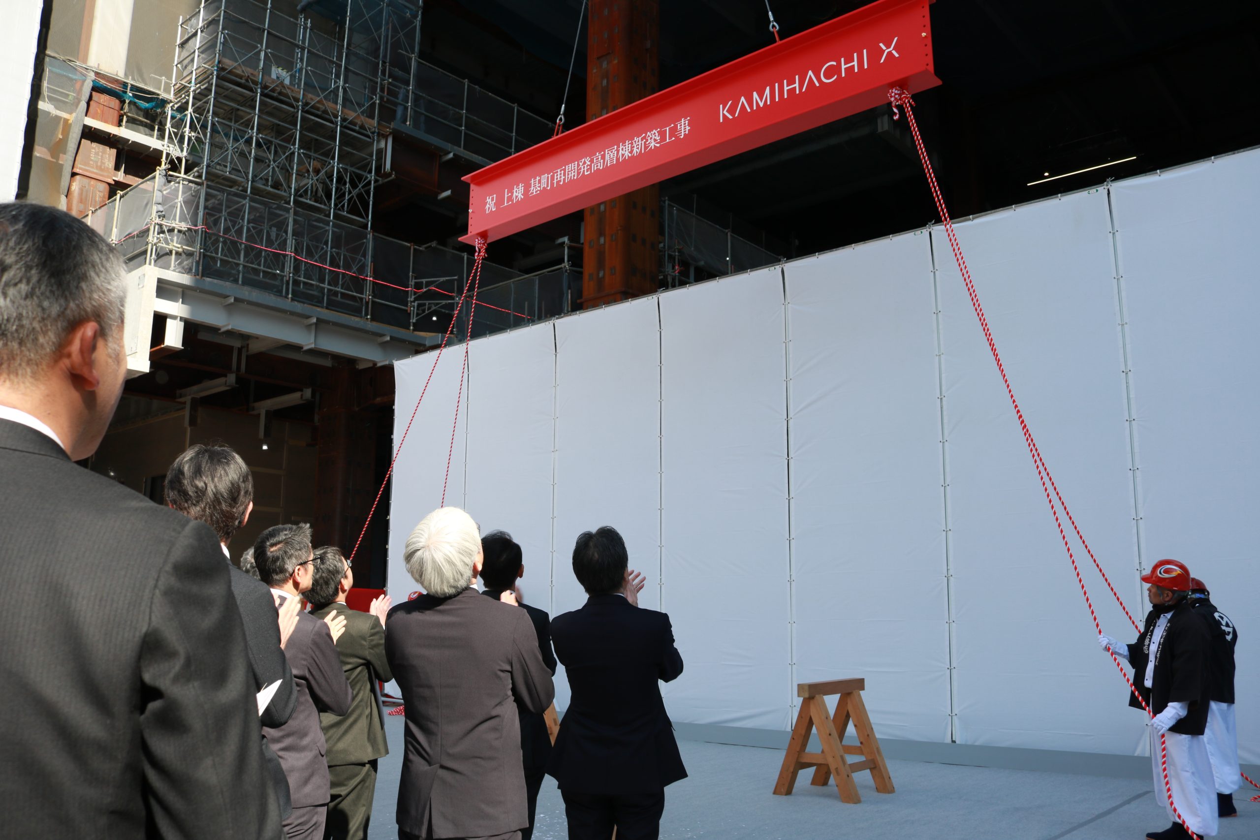 上棟式の後には棟上げ行事も実施されました。長さ6m、重さ1.2tの鉄骨をクレーンで持ち上げる様子は、圧巻! 関係者からは「広島駅も新しくなっているので、駅とカミハチ両方で街を盛り上げていきたい」との声もありました。